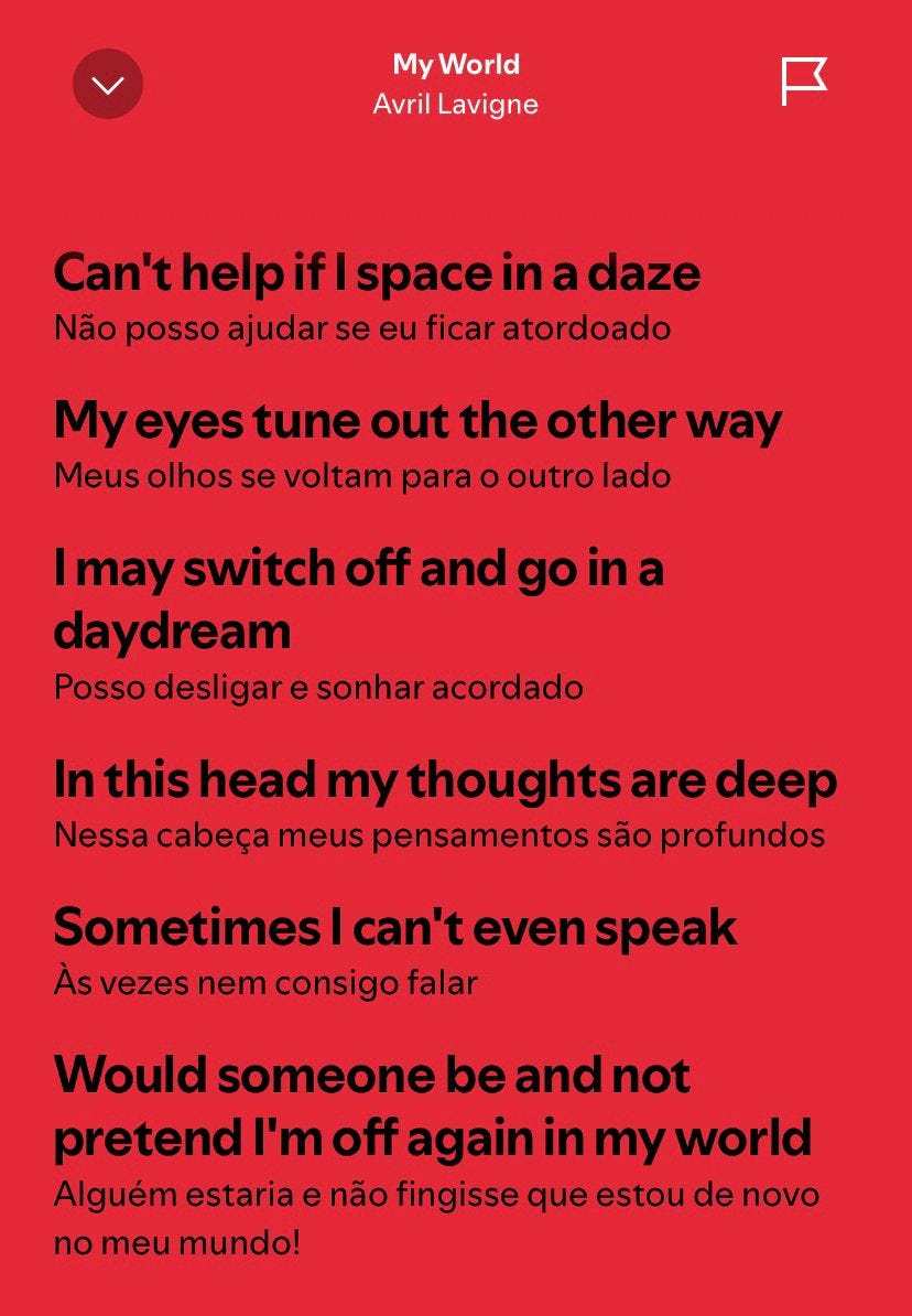 Quando a professora me dava bronca por conversar demais e na tentativa de evitar distrações alterava o mapa e me deixava longe das minhas fofoqueiras para que focasse na aula, pasmem havia outro meio de distração! a tal da fantasia, eu abaixava a cabeça ou olhava para o nada (e pensava em tudo, literalmente), onde meu cérebro ia para longe com riqueza de detalhes, enredo e dopamina. Eu pensava “coitada, ela acha que irei prestar atenção” mas enquanto ela achava que sim, eu estava era bem ocupada.